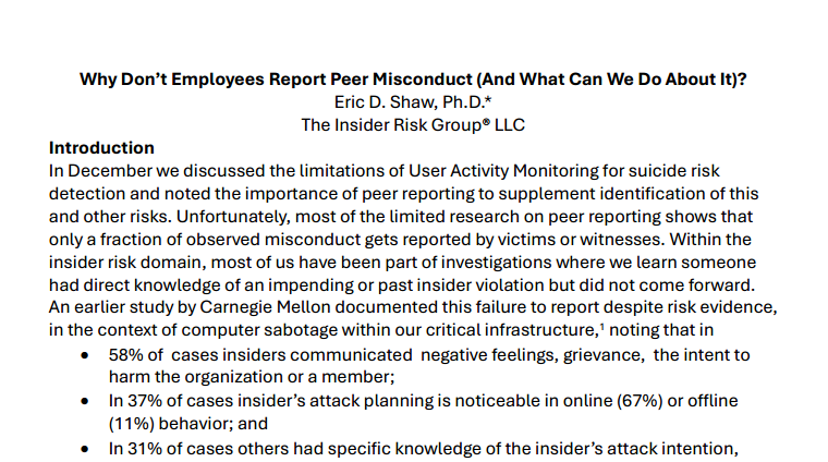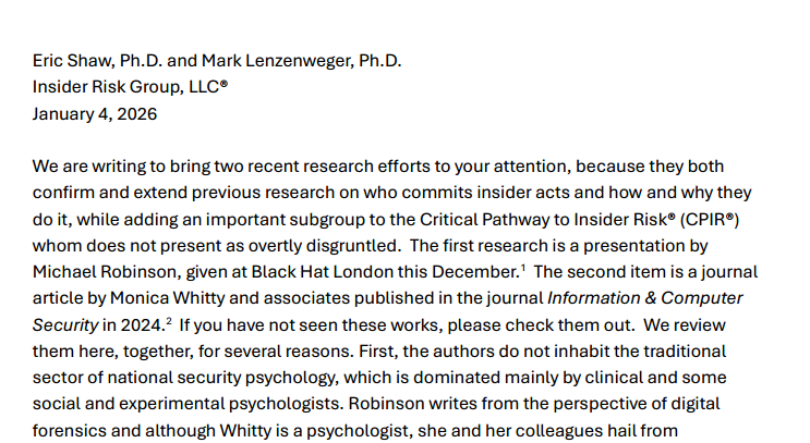 We are writing to bring two recent research efforts to your attention, because they both confirm and extend previous research on who commits insider acts and how and why they do it, while adding an important subgroup to the Critical Pathway to Insider Risk® (CPIR®) whom does not present as overtly disgruntled.
